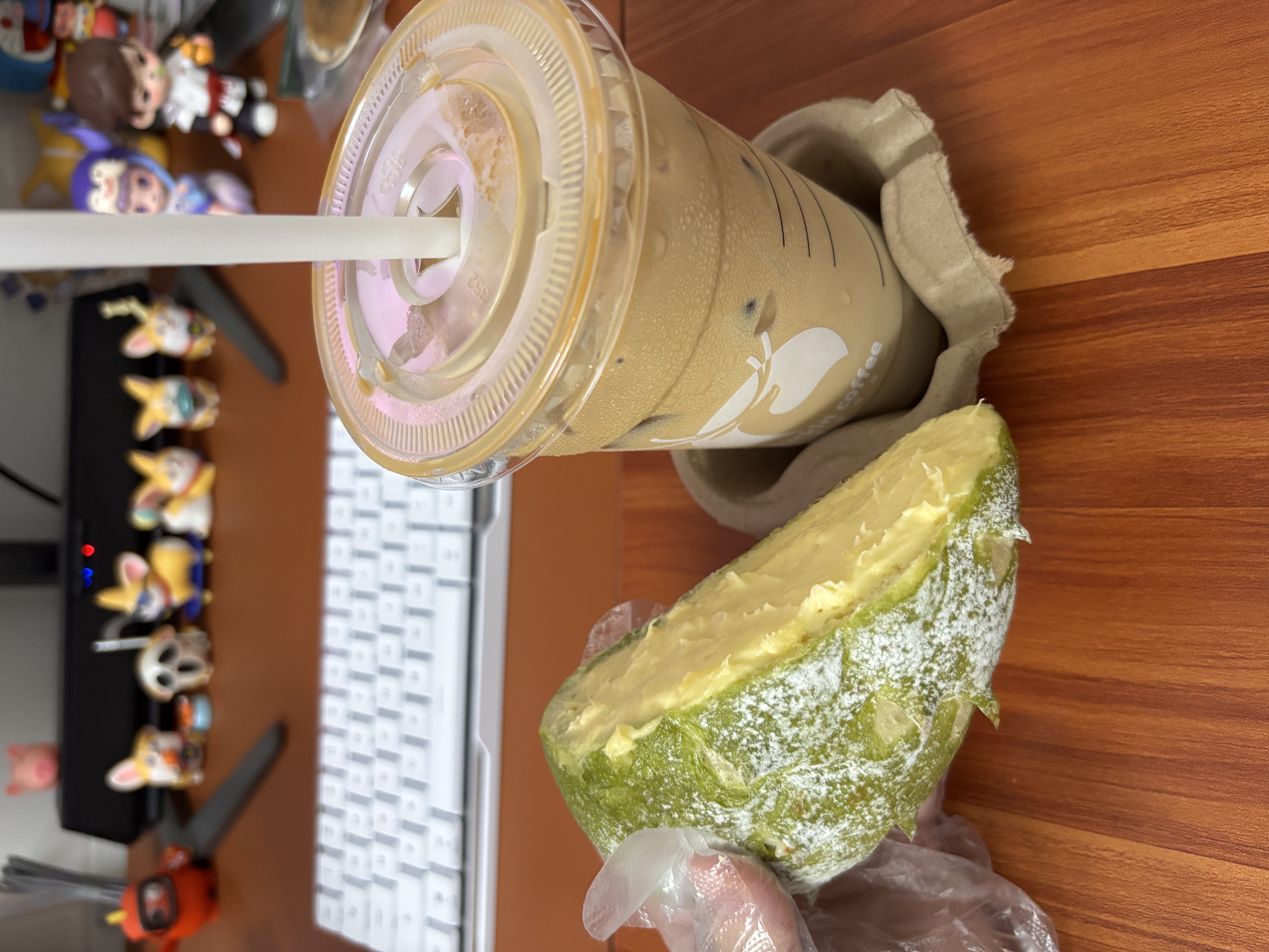 回程照旧买了瑞幸生椰拿铁,配上榴莲软欧。宅家打游戏,这种安逸感给个社长都不换。布丁面包不腻,好评,虽然不记得具体名字了