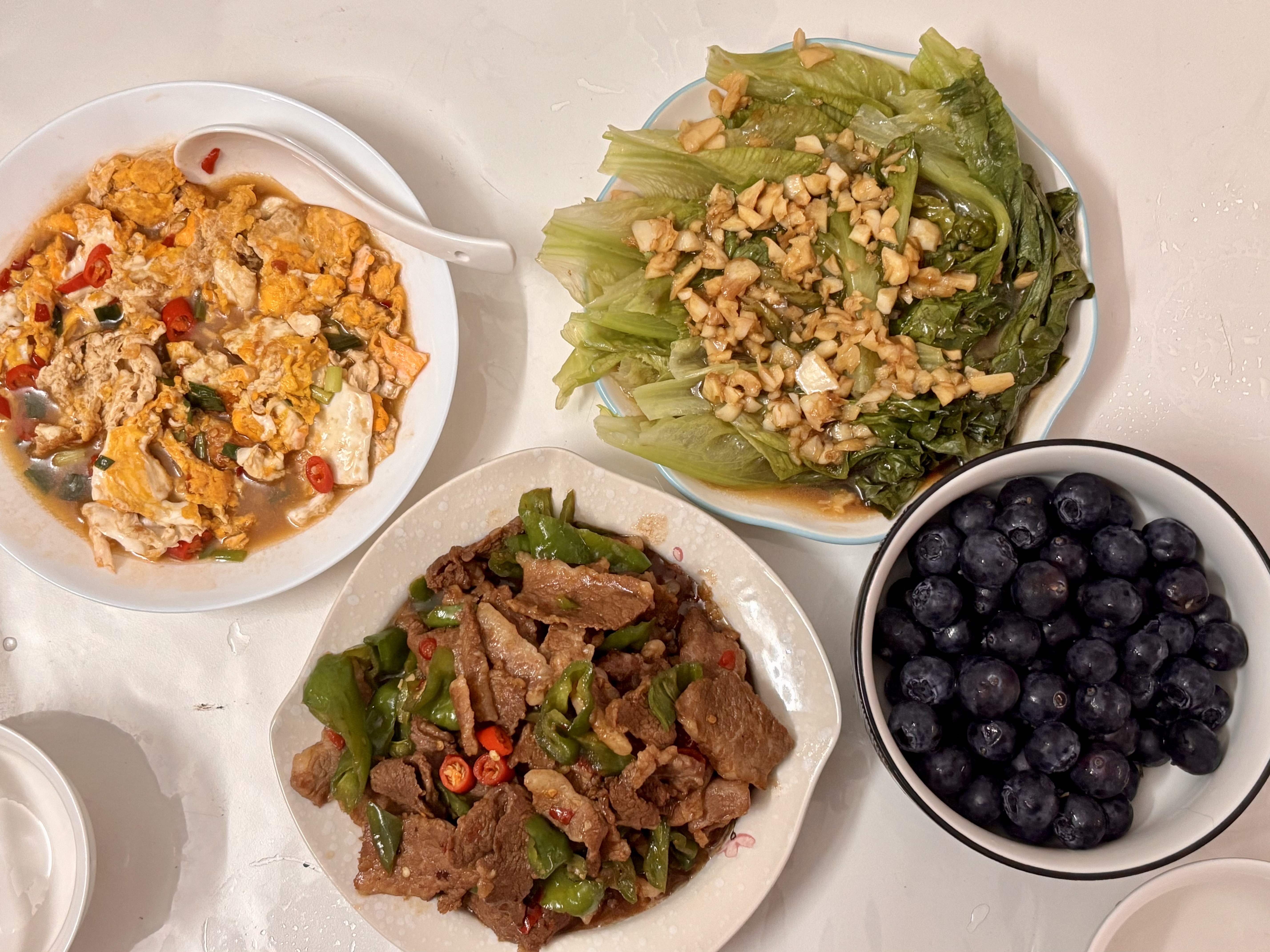 一直想复刻湘菜。做了醋溜鸡蛋、辣椒炒肉和蒜末生菜。醋溜鸡蛋挺惊艳,辣椒炒肉下手重了点,偏咸。发现自己现在越来越能吃辣