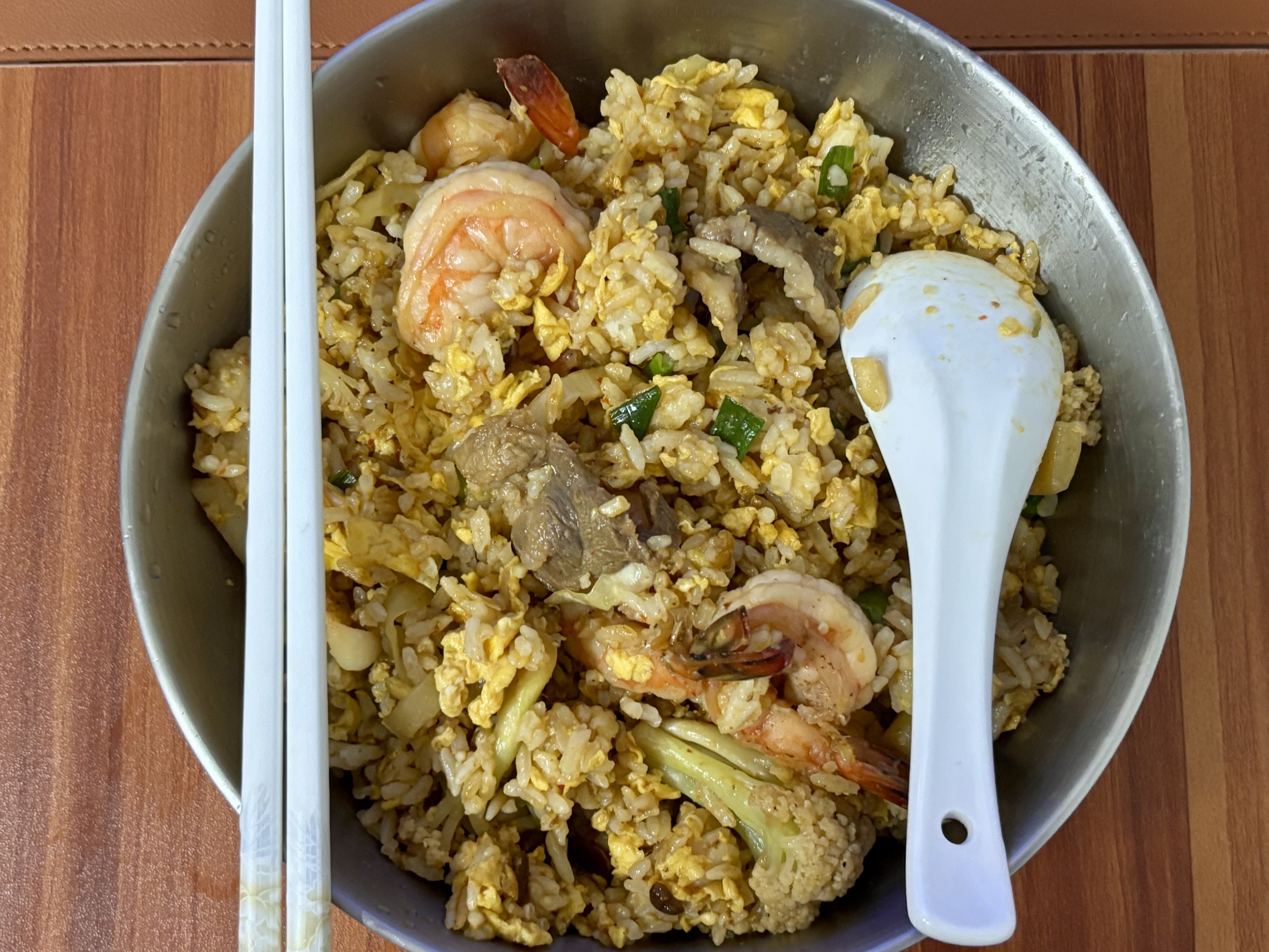 老姐回家了,发来一堆家里海鲜大餐的照片。吃不到妈妈做的菜,只能隔着屏幕气鼓鼓。默默把昨天剩下的食材做了份炒饭,味道倒也可香
