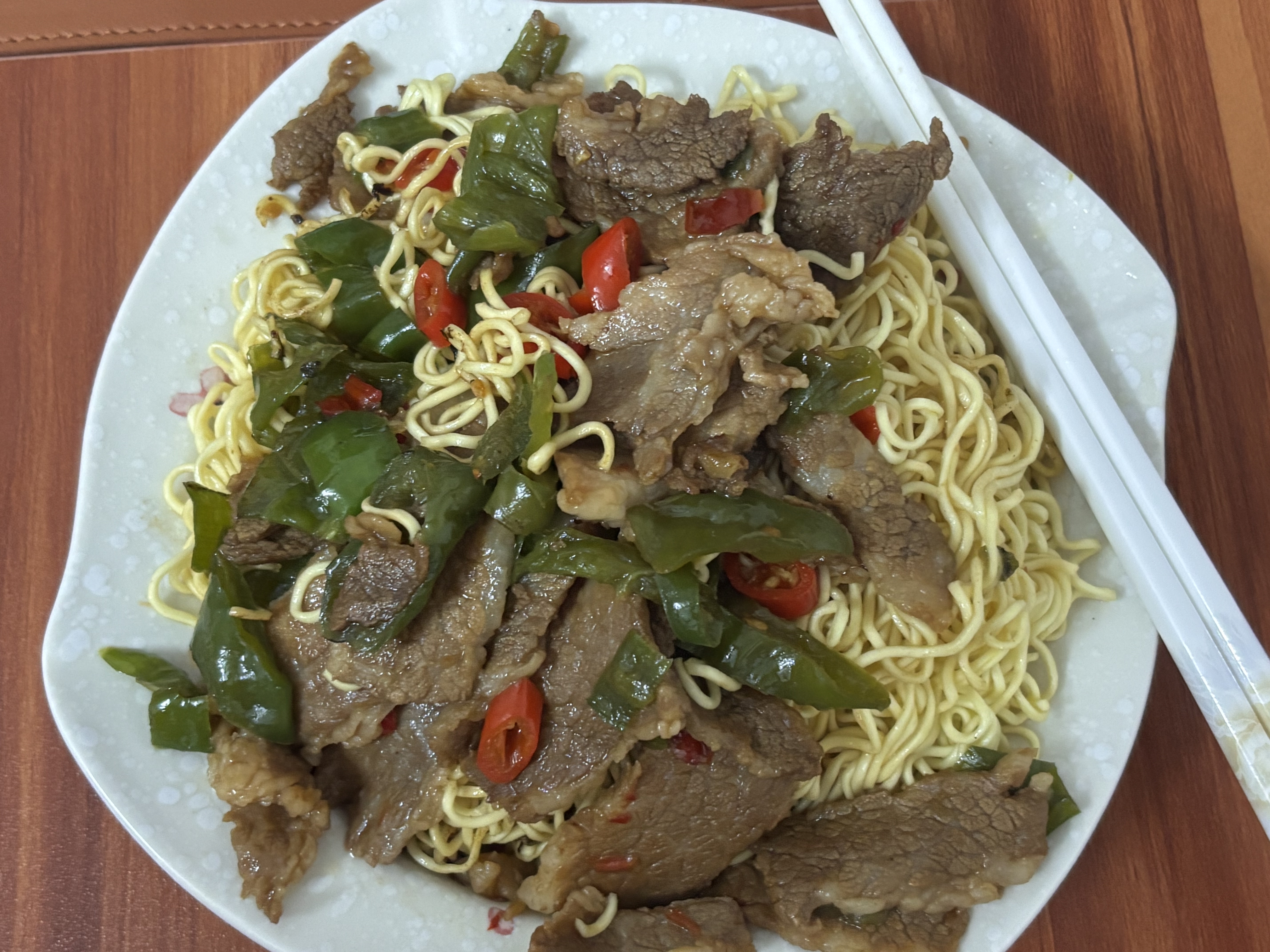 辣椒炒肉拌面,面条劲道,重口味的肉汤裹上去正合适。吃完上号打了把海克斯大乱斗,上了点分